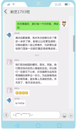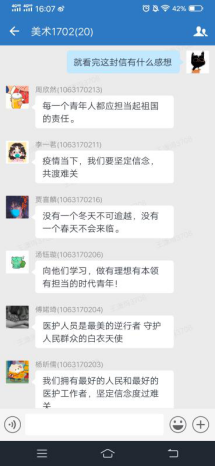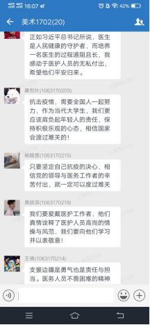 学院精心组织全体师生齐聚“云端”,通过线上集体学习、个人自学等方式收看疫情防控思政大课直播,并组织学生开展课后讨论,发表感想。同学们讨论踊跃,工设1902团支部书记韩志鹏表示“自豪,这是我在看完整个讲座后脑海中第一个浮现的词语。虽然我未曾身入前线,与千百万医护人员同生死,共命运,但这两个月中政府,以及社会群众所做出的点点滴滴是潜移默化的,这无不提醒着我,我们中国人是拧成一股绳的,我们有能力战胜并在疫情中获得未来进步的机遇。”