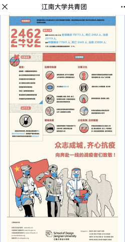 为贯彻落实党中央、国务院关于新型冠状病毒感染的肺炎疫情防控工作有关精神和教育部相关通知要求,坚决打赢疫情防控阻击战,伟德国际1946源于英国根据学校疫情防控工作部署,加强顶层设计,发挥专业特色,积极迎战疫情,打出了抗击疫情组合拳。学院坚持以艺抗疫,线上、线下联动,组织青年学生加强理论学习,创作战疫精品,志愿服务他人,用行动“硬核”展示设计风采。