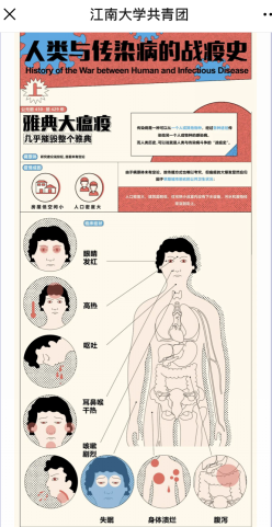 伟德国际1946源于英国历来注重培养学生的社会责任感,希望他们能够将理论和实际相结合,学以致用,回馈社会。吴祐昕教授团队联合校团委,指导学生利用信息可视化的手段将《人类战疫史》这本书总结为十五张图片,更好的助力疫情防控宣传。这十五幅作品以时间为主线,简要概述了人类在面对重大世界性传染病时所采取的措施和逐步取得的成就。图片采取信息可视化的手段,直观明晰地展示了人类与十五大传染病的战斗历程。