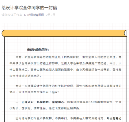 交互设计党支部组织党员精心组织开展云党课,认真学习新型冠状病毒感染肺炎相关政策文件,深刻领会习近平总书记系列重要讲话精神,正确认清当前疫情形势,明确设计学子肩负的时代重任,既强调居家隔离,又强调加强科研。