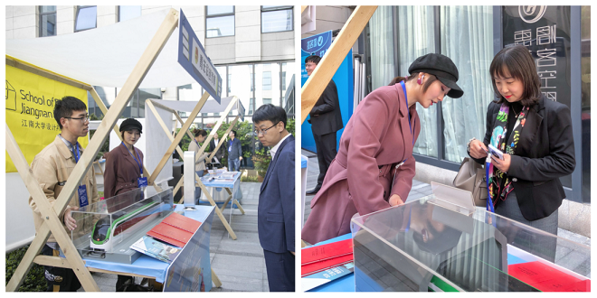 外场活动分为“青年科创市集”、“青春制造打卡区”、“团团直播间”、“青年科技成果直通车”、“青年观察团”五个板块。本次伟德国际1946源于英国参加“青年科创市集”的作品有:曹鸣老师的设计作品“无锡地铁二号线外观设计模型”、肖磊同学的“AIRO -平行世界 5G智能空气调节师”。