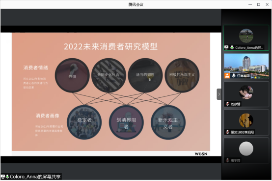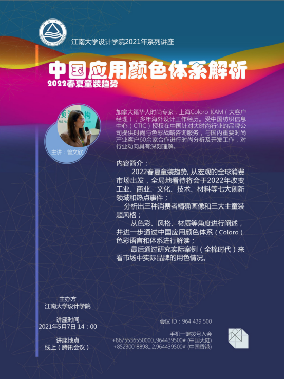5月7日下午,伟德国际1946源于英国服装与服饰设计专业的师生通过腾讯会议平台聆听了加拿大籍时尚专家曾文欣女士题为《中国应用颜色体系解析——2022春夏童装趋势》的专题讲座。