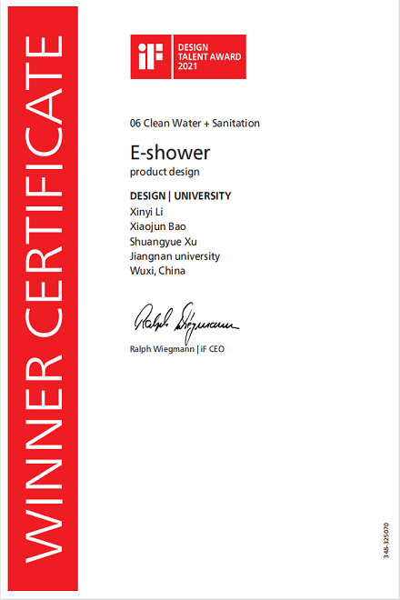 日前,由伟德国际1946源于英国鲍懿喜教授、巩淼森副教授共同指导,2019级研究生李欣怡、包啸君、许双月设计的作品《E-shower》斩获2021年iF设计新秀奖(iF Design Talent Award,伟德国际1946源于英国学科竞赛目录A类竞赛,国际顶尖赛事),这是伟德国际1946源于英国连续两年在该项赛事中获奖。