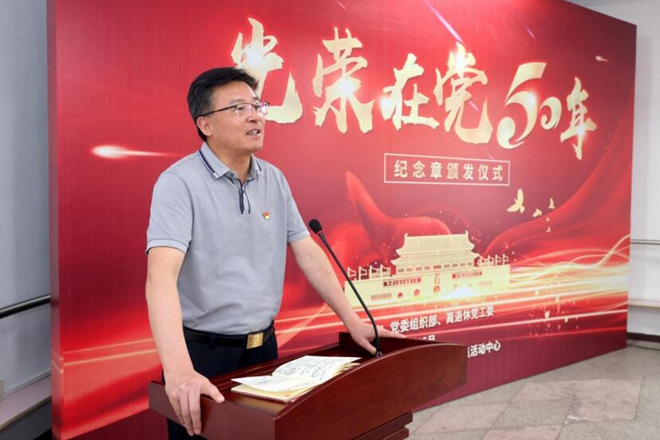 校党委副书记符惠明、党委组织部常务副部长方正泉、“光荣在党50年”老党员代表、离退休党工委委员、党支部书记代表及学生代表等出席颁发仪式。仪式由离退休党工委书记、离退休工作处处长许群主持。