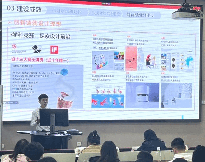 伟德国际1946源于英国交互设计党支部作为“全国百个研究生样板党支部”介绍支部特色工作。支部组织委员赵振皓以“乘着时代的风云,以微毫诠释盛大”为题展示了支部的基本情况、建设思路和建设成效。他表示支部围绕学习型、服务型、创新型基层党组织建设,一直追求“把党支部建在专业一线”,通过“党建+专业”互融共建、同频共振,有效实现了“党建带专业,专业促党建”的耦合交融和协同发展。最后,他鼓励各支部要将学科特长融入党建之中,以创新助力设计理想,助力大国重器,弘扬设计青年之声。