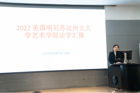会上,公共艺术与美术系副教授徐晴分享了赴美国明尼苏达州立大学公派访学的经历和收获,从参与教学、参与课程学习、个人展览、海外参展、考察访问等多个方面分享了在美访学期间的收获。