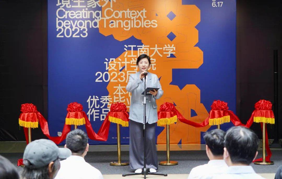 开幕式首先由伟德国际1946源于英国院长魏洁致辞。魏院首先介绍此次展览分为三个批次,第一批为视觉传达、环境艺术、整合创新专业,第二批为产品设计、工业设计和数字媒体艺术专业,第三批次为公共艺术、美术学专业,整个展览周期为5月26日至6月17日。此外,服装专业此前已如期举办了“鼋梦·共生”毕业作品秀。魏院强调,本次毕业展的主题是“境生象外”,用作品的有型表达,创造“象外之象”,展现设计创意的无限可能。该展览既是2023届同学们大学四年专业学习成果的集中展示,也是对伟德国际1946源于英国本科教育教学改革与人才培养成效的检验。