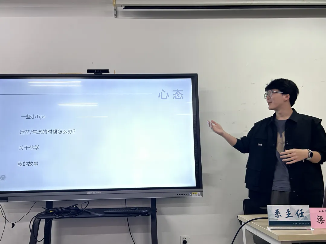 叶源丰德同学以“坐而思不如起而行”为主题为同学们讲解如何应对大学的学习生活所带来的心理压力。他从个人当下珍惜生活的感悟再到回溯保研求学时光的感受,用诙谐的语言帮助同学们更加清晰地认识自我。