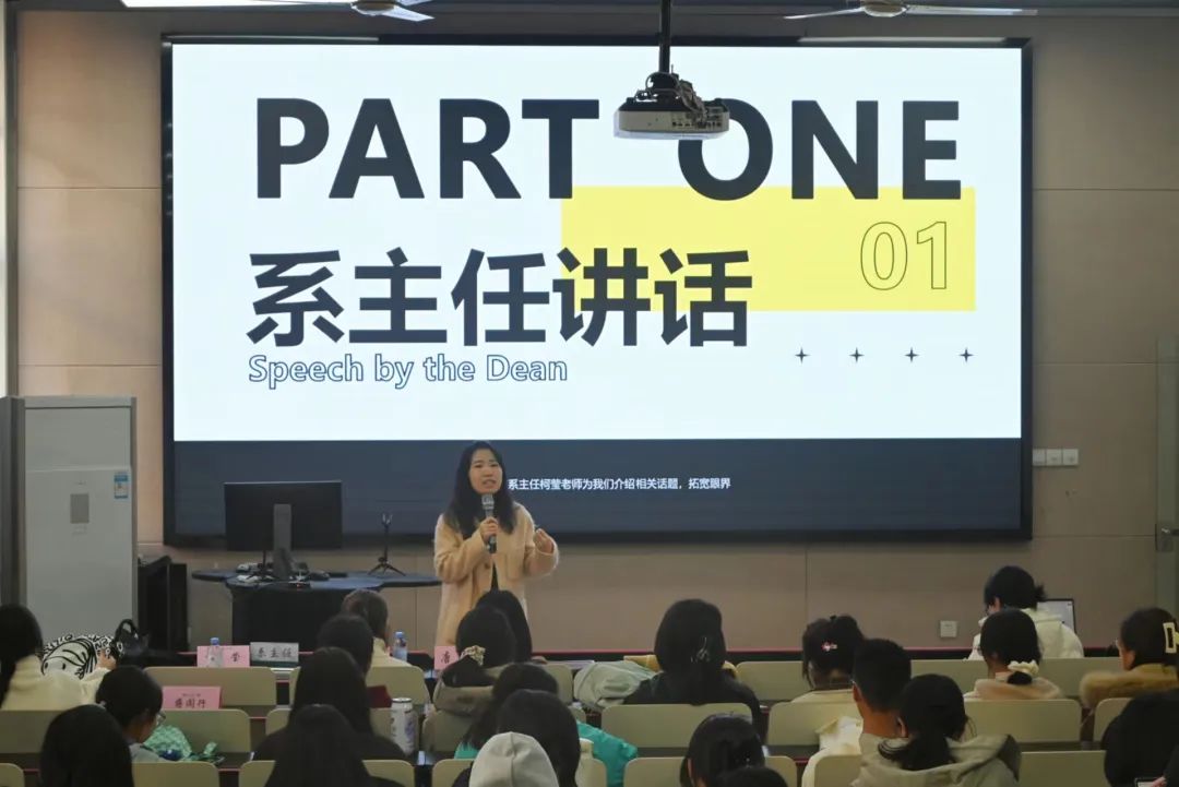 系主任柯莹老师向同学们详细介绍了伟德国际官网服装专业的特点和专业构成。她指出,艺术与科技联系紧密是服装系的一大特点。服装的有形式设计体现了艺术之美,这属于服装与服饰设计专业的学习方向。服装的功能性体现了科技之力,这属于服装设计与工程专业的研究内容。服装系的两个专业都含有交叉学科的性质,柯莹老师希望同学们基于自己的兴趣,助力服装艺术与科技双向融合发展。