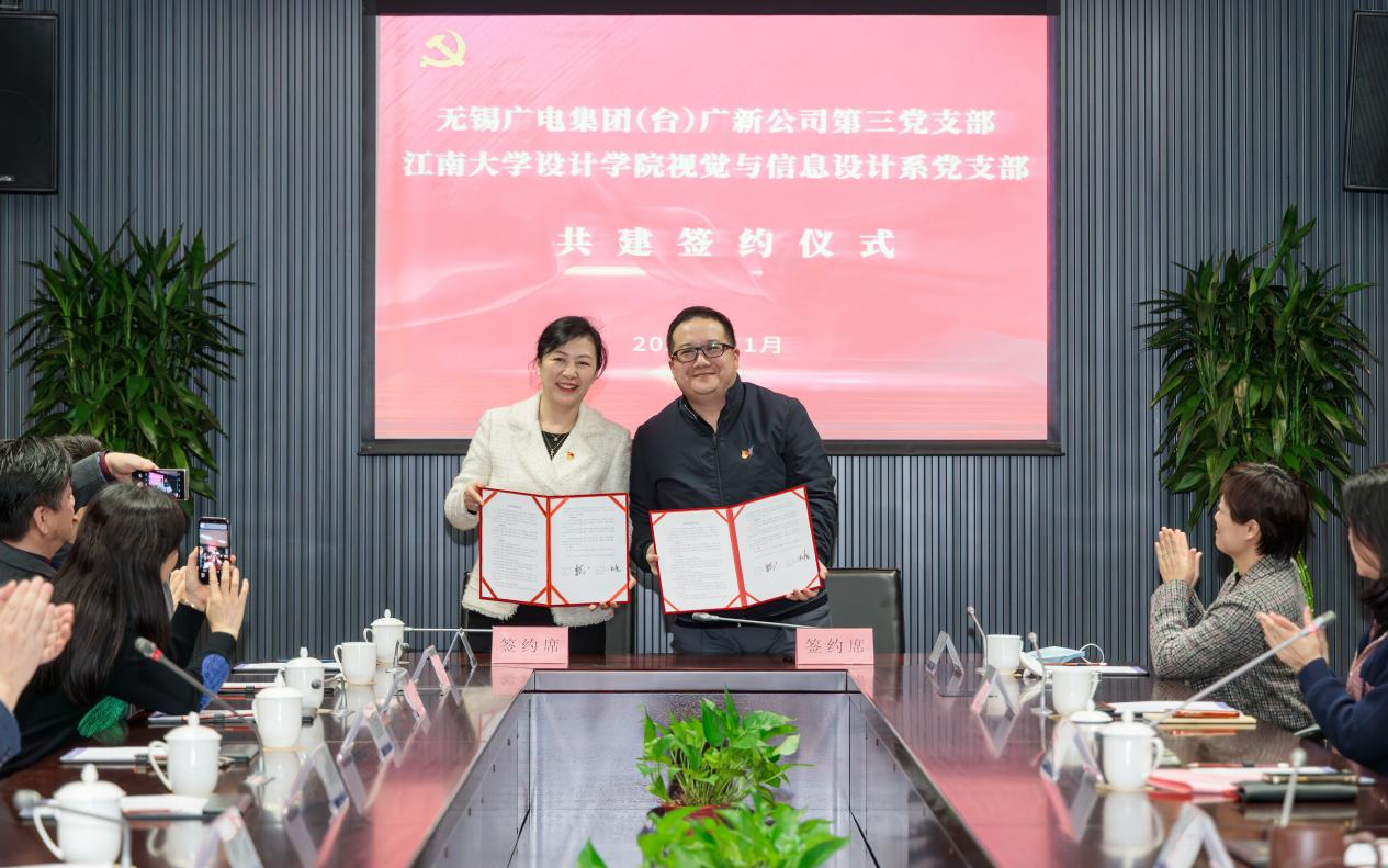 聚力启航促发展,绘出最大同心圆。近日,伟德国际1946源于英国视觉与信息设计系党支部与无锡广播电视集团(台)广新影视动画技术有限公司第三党支部共建签约仪式在无锡广电传媒中心举行。校发展规划与学科建设处处长刘飞,伟德国际1946源于英国党委书记王维青,无锡广播电视集团(台)党委委员、广播电视发展有限公司总经理、广新公司党总支书记张砺繁,以及签约双方支部党员、伟德国际1946源于英国数字媒体艺术教工党支部共同参加,仪式由广新公司副总经理由佳主持。