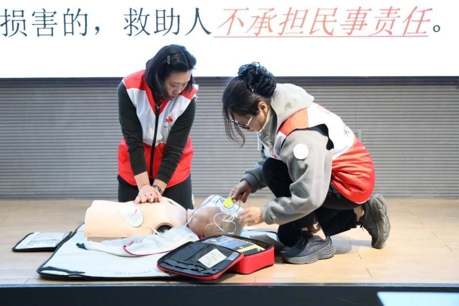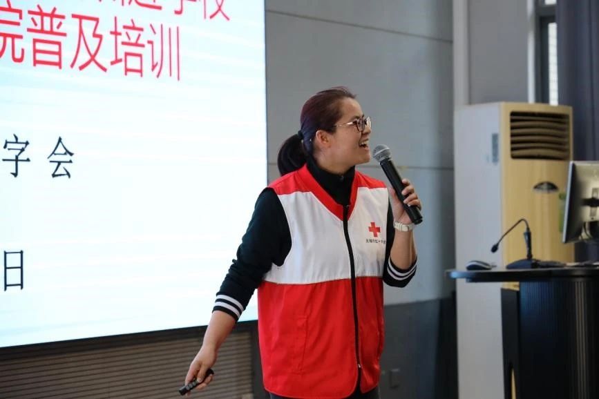 活动伊始,无锡市滨湖区红十字会的指导老师为现场同学们带来了生动的急救知识讲座。指导老师通过案例分析、理论讲解和模拟演示相结合的方式,生动地介绍了心肺复苏、触电急救、癫痫、昏迷、气管异物梗阻等常用急救技能。讲座上,指导老师特别强调了急救顺序原则:确认环境安全、判断意识、合理救护、心理支持、救护现场协作。同时反复叮嘱同学们在进行急救时首先要确认周围环境,在确保自身安全的前提下进行救助。在讲解AED的使用时,指导老师也为我们总结了简洁的九字原则“打开它,听它说,跟它做”。这些生动、实用的教学让同学们对急救知识有了更加直观和深刻的理解。