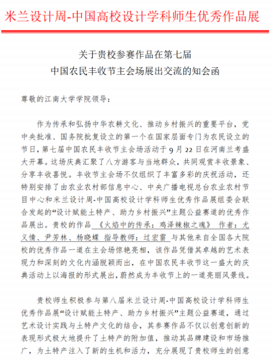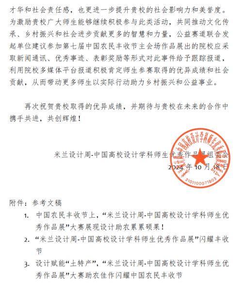 习近平总书记在 2022 年中央农村工作会议上强调要“做好‘土特产’文章”,创新发展土特产对振兴乡村具有重要意义。在此背景下,米兰设计周-中国高校设计学科师生优秀作品展组委会联合中央广播电视总台农业农村节目中心、农业农村部信息中心以及多家知名设计院校,在第八届“米兰设计周-中国高校设计学科师生优秀作品展”活动中联合发起主办“设计赋能‘土特产’,助力乡村振兴”公益赛道,引导和鼓励在校师生学以致用,为乡村振兴事业作出贡献,共征集来自全国766所院校的12,967件优秀作品,其中80件具有代表性的作品在此次中国丰收节主会场进行展出。此前两天,中央广播电视总台与农业农村部在北京签署战略合作框架协议,共同推进三农宣传等领域的合作,签约活动上亦展出了多幅来自大赛“土特产”公益赛道的优秀设计作品,通过艺术与土特产文化的结合,让土特产焕发出新的生机和活力。